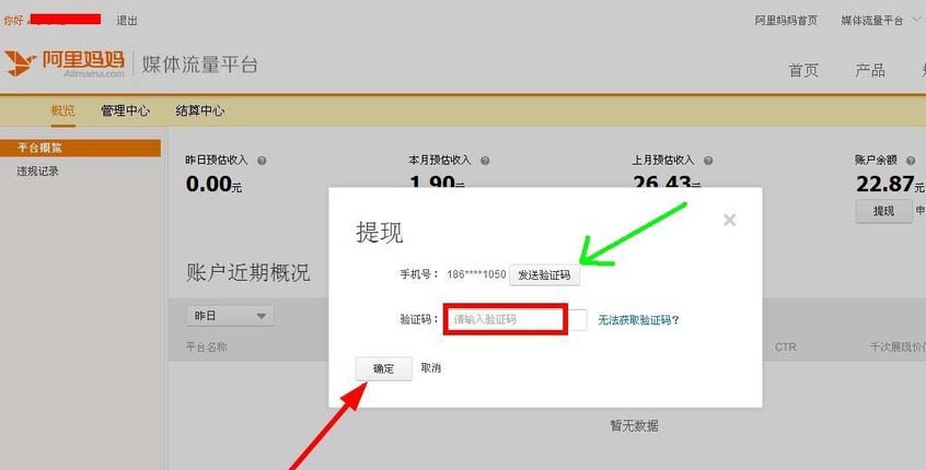 5、輸入提現金額和驗證碼,點擊確定。