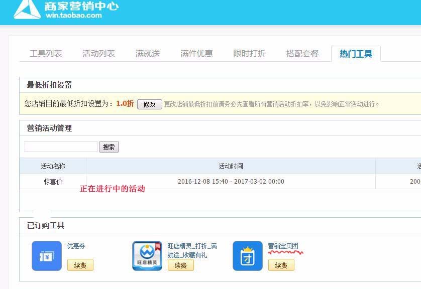 5、在營銷管理中你會發現正在進行的活動,而驚喜價活動的產品添加就在營銷寶貝團中,點擊進入。
