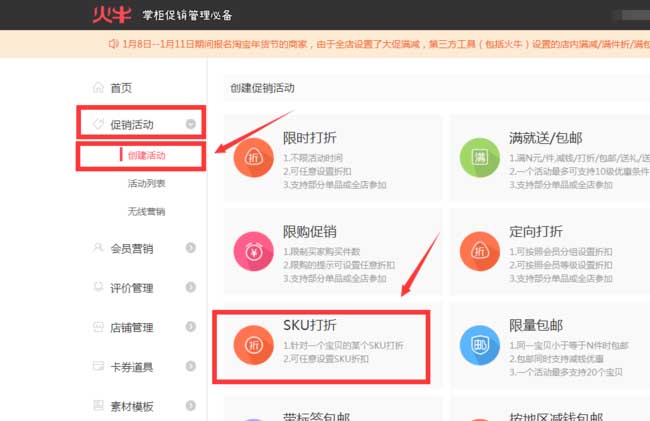 2、進入到軟件后臺,點擊促銷活動選擇“創建活動”,然后選擇“SKU打折”功能進行打折操作