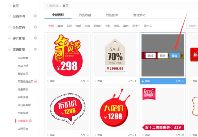 2、在左側的快捷菜單欄我們選擇“店鋪管理”-“主圖圖標”,選擇自己中意的圖標進行“編輯”。
