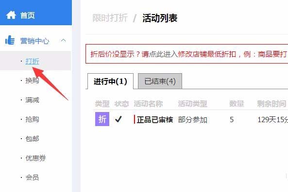 2、打折。小編開店使用的第一個功能就是打折,在左側營銷中心點開打折進入,然后右上角點擊新建打折,選擇部分商品參與,查找到要打折的寶貝,在打折的空白處輸入折扣,例如打五折填寫50折,然后保存,一個寶貝的打折就設置成功了,其他寶貝依次類推。
