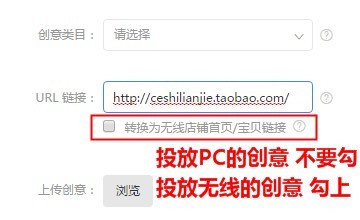 PC的資源位只能投放PC的鏈接;無線的資源位只能投放無線的鏈接。在創意上傳、填寫鏈接的時候,請務必確認清楚該創意要投放PC還是無線。如圖: