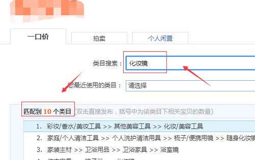 4、比如我輸入了“化妝鏡”,然后點擊后面的快速找到類目,淘寶就給我自動推薦了好多,一般推薦的第一個就是最準確的,可以選擇。