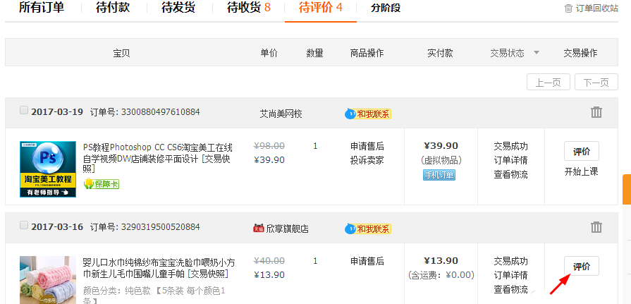 3、接著選擇一款你想要評價的寶貝,點擊進去,如下圖紅箭所示,