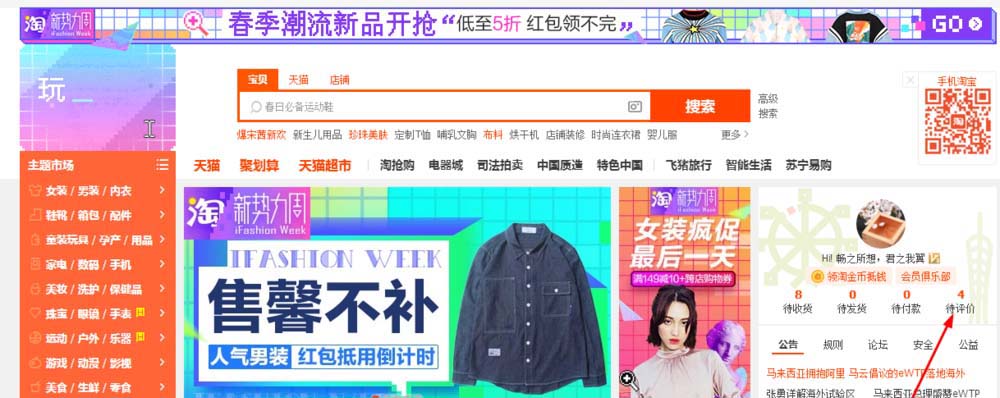 2、在首頁就可以看到我們確認收貨后待評價的數量,點擊進去會直接跳轉到待評價的寶貝選項中。