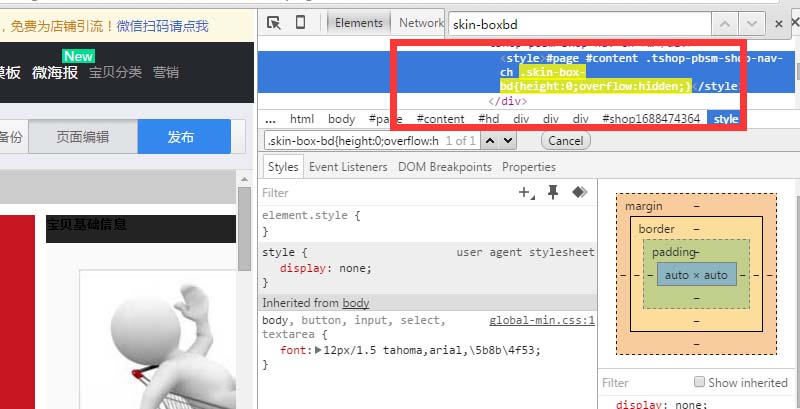 9、然后點右鍵--審查元素-CTRL+F -再將.skin-box-bd{height:0;overflow:hidden;}放入搜索框搜一次,再次選中搜索出來的結果