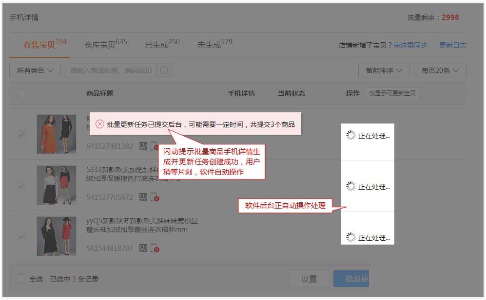 4、勾選商品,點(diǎn)擊右下角【批量更新】,浮出提醒,如下圖: