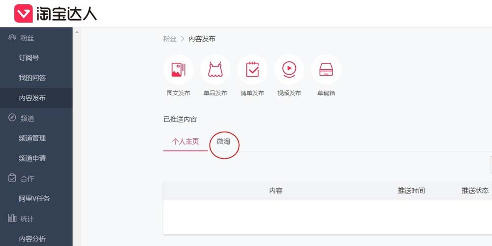 4、進入后臺。在這里就可以發文了,你可以選擇發文到主頁還是微淘。