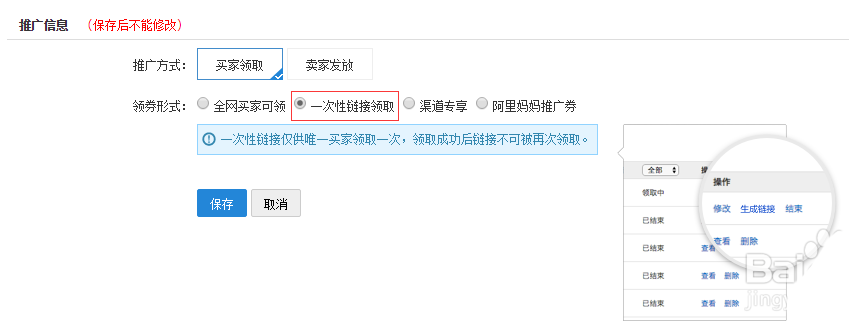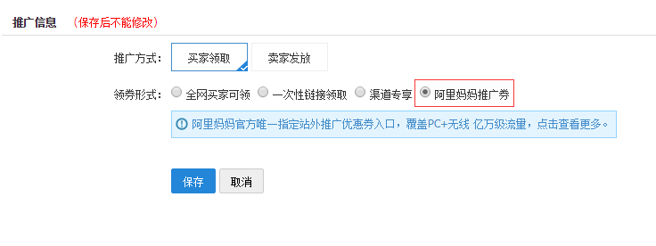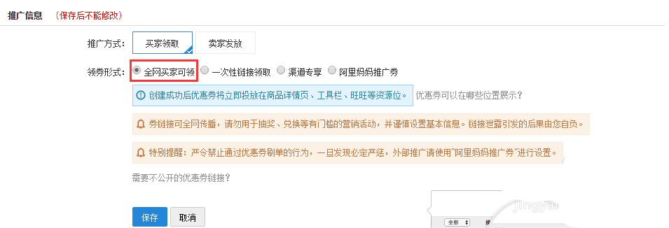2、按照需求設(shè)置優(yōu)惠券的基本信息,包括名稱,使用位置,面額,使用條件等。最后在選擇優(yōu)惠券的推廣方式及領(lǐng)券形式。點(diǎn)擊【保存】按鈕,即設(shè)置完成。