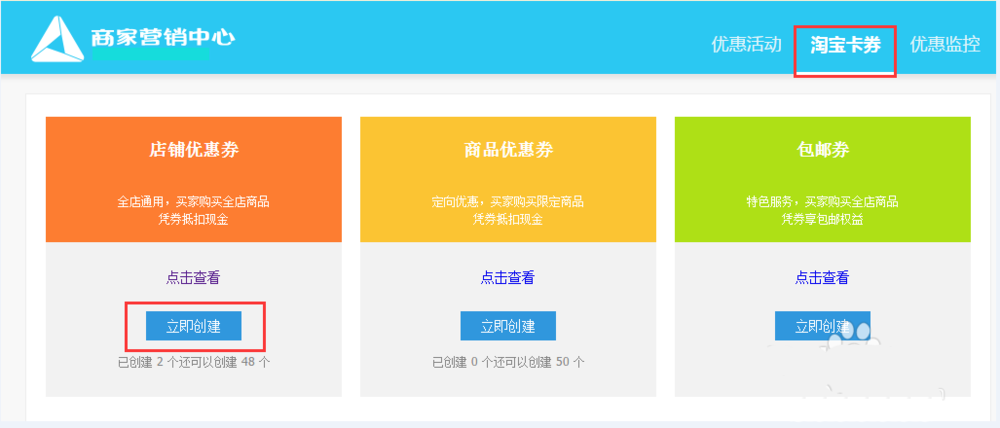 1、在賣家中心找到【營銷中心】分類下的【促銷管理】。進(jìn)入促銷管理后,選擇【淘寶卡券】標(biāo)簽中的店鋪優(yōu)惠券,點(diǎn)擊【立即創(chuàng)建】按鈕。進(jìn)入優(yōu)惠券設(shè)置中。