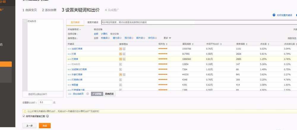 5、選擇關鍵詞(可選200個)、設置出價→完成