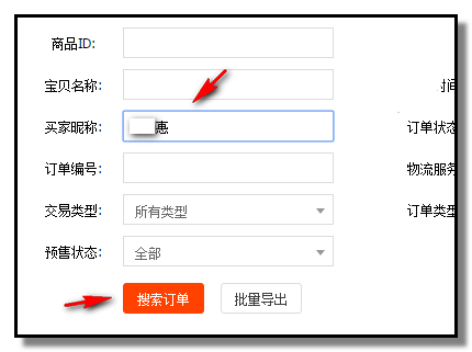 4、然后,鼠標定位在“買家昵稱”這里,把旺旺號粘貼在輸入框內。如下圖所示。然后,點擊搜索,下方即彈出該買家的所有訂單,訂單中顯示商品的主圖、商品標題、商品尺碼、顏色等等信息;從這里就能查看到該買家是否復購了。