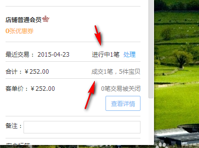6、在聊天界面的右下方,顯示著該買家的交易信息;顯示著,成交與進行中的交易。