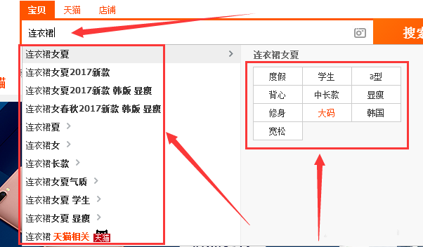 7、另一瀏覽器窗口,點(diǎn)擊進(jìn)入淘寶網(wǎng)首頁,點(diǎn)擊搜索欄輸入連衣裙。這里有很多淘寶官方推薦的熱門關(guān)鍵詞,根據(jù)我們的寶貝相應(yīng)的來找關(guān)鍵詞。