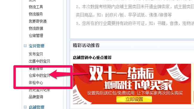 2、接著在賣家中心選擇倉庫中的寶貝。