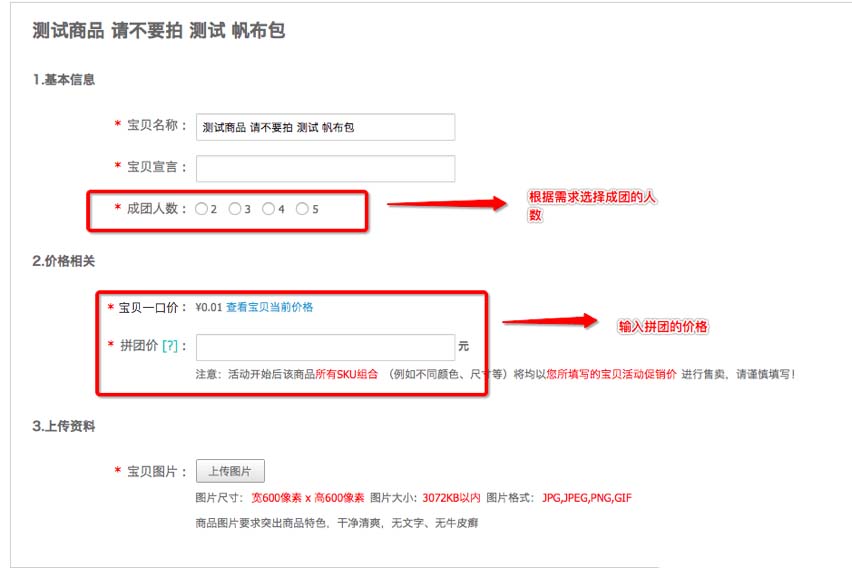 選擇商品后,填寫商品的拼團活動核心信息。