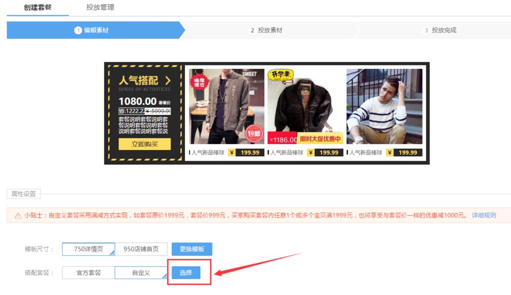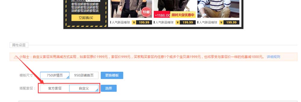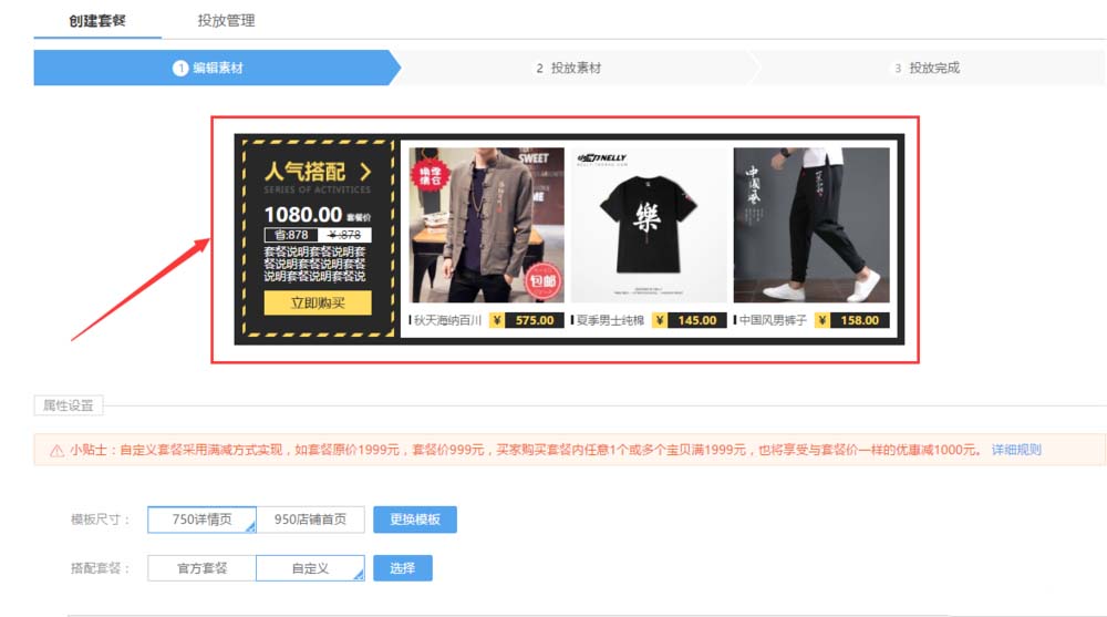 3、在搭配套餐設置頁面選擇【創建套餐】標簽,進入新搭配套餐設置頁面。在該頁面可以預覽搭配套餐的效果,在【屬性設置】模塊,根據搭配套餐投放的位置,選擇套餐模板的尺寸。