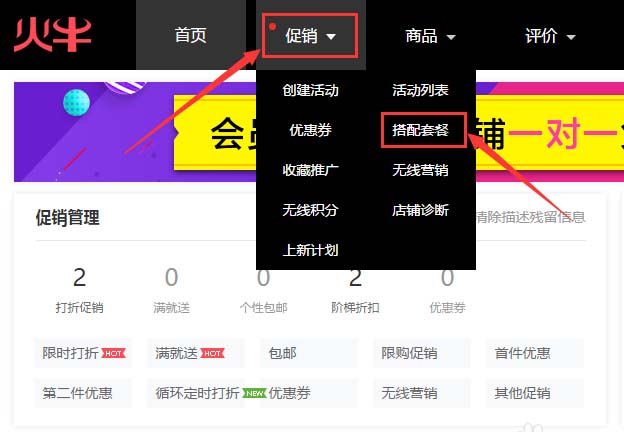 2、在火牛首頁導航欄找到【促銷】中的【搭配套餐】選項,點擊進入搭配套餐設置頁面。