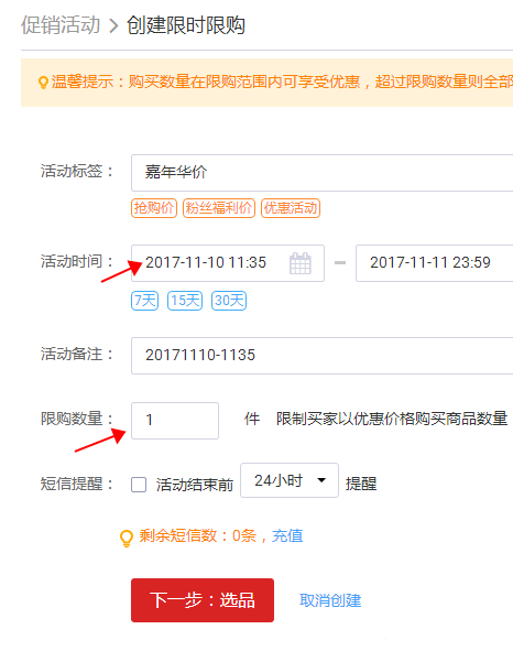 2、創(chuàng)建一個限時限購的活動,設置好時間和數(shù)量,因為是秒殺,所以我們限制一個ID購一件,這里很關鍵哦。