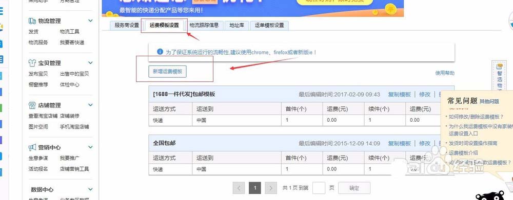 3、選擇“運費模板設置”,點擊“新增運費模板”;