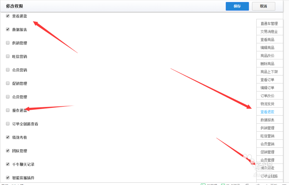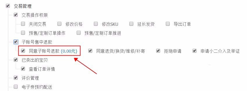 6、回到權限修改的頁面,如果依然不能點擊,那是因為需要刷新一下頁面后,再重復第4步操作。勾選【同意子賬號退款】后點擊保存,頁面的會增加一個金額選項