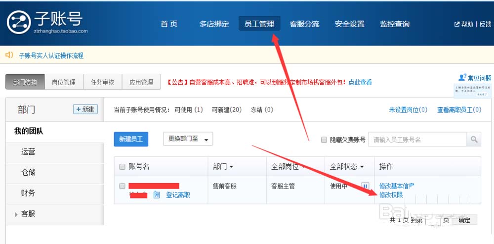 2、點擊【員工管理】,找到需要授權的員工,進入【修改權限頁面】