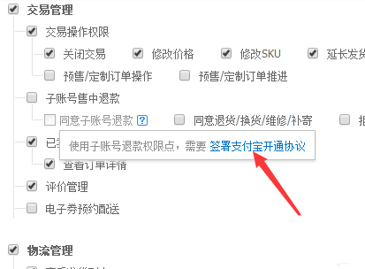 4、在修改權限頁面,點擊右側的【交易管理】快速找到左側對應的權限,鼠標移動到左側的【同意子賬號退款】的文字部分,頁面會浮現(xiàn)出“需要簽署支付寶協(xié)議”,點擊藍色的字就可以到達協(xié)議簽署頁面。