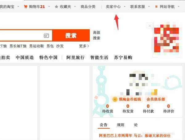 2、點擊淘寶賣家中心。然后在頁面的右上角點擊淘寶賣家中心,在這里就可以直接來找到開通的入口了。