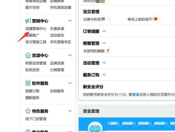 3、點擊店鋪營銷中心。在賣家中心的頁面里可以看到很多關于賣家的設置,這邊需要找到左側的店鋪營銷中心,切換到這個頁面。
