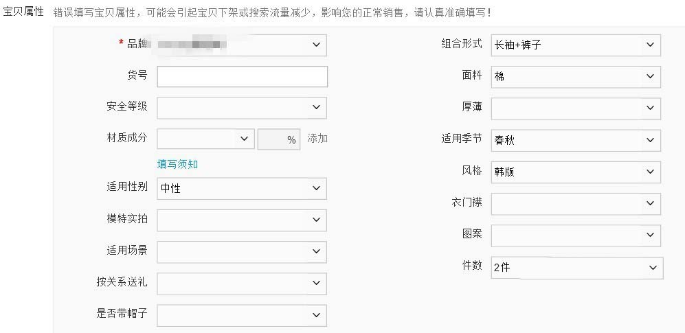 3、接著就是寶貝屬性了,一定要根據(jù)自家寶貝填寫。如果錯(cuò)誤填寫寶貝屬性,會(huì)引起寶貝下架或者搜索量減少呢,如圖所示。
