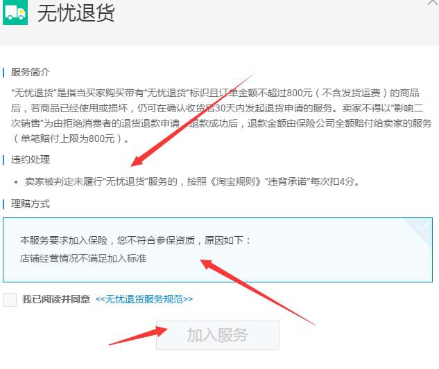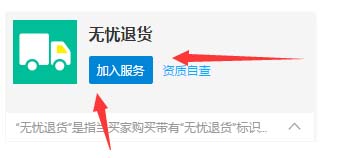 5、頁面跳轉成功后,進入加入服務頁面,選擇需要加入的服務無憂退貨,可以資質自查一下也可以直接點擊加入該服務如下圖所示