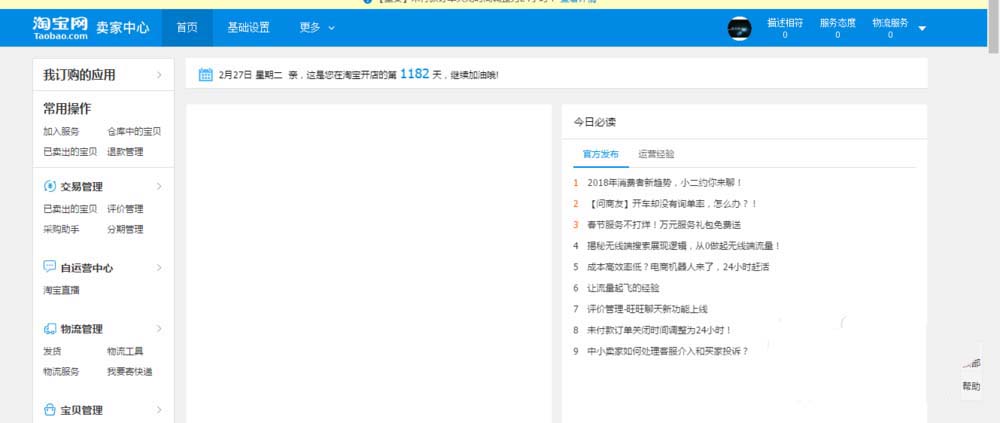 3、登入后系統會自動跳轉到賣家中心首頁頁面,可以看到如下圖所示頁面,左側顯示的是店鋪管理入口。