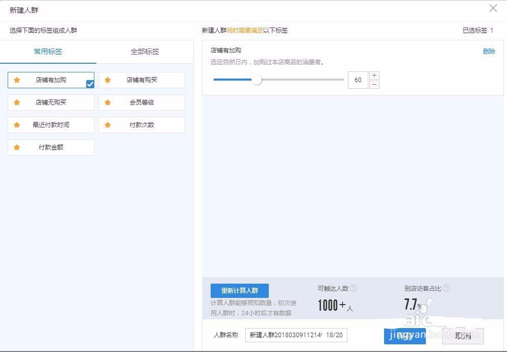 3、點擊新建人群,系統會推薦常用標簽和全部標簽,通常我們會圈定加購,收藏,會員等級,付款次數這幾個比較重要的標簽,