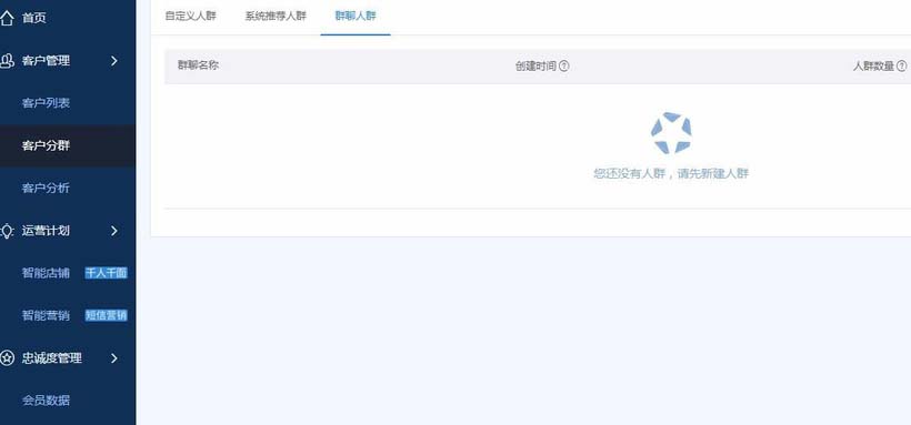 1、打開淘寶天貓店鋪后臺,點開客戶運營平臺—客戶管理—客戶分群,這里我們可以看到有客戶人群,我的人群,新建人群等幾個操作選項。另外如果有創建千牛群,這里也能顯示群體