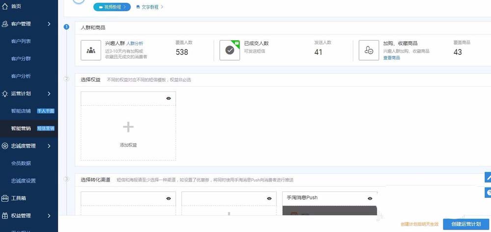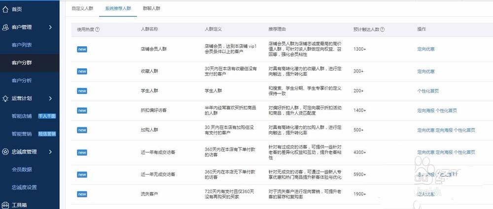 2、在沒有新建人群之前,我們可以查看系統推薦的人群,系統推薦的人群涵蓋加購客戶,會員客戶,收藏客戶等等非常多的方面,每個推薦人群背后有定向優惠,海報活動等操作選項。