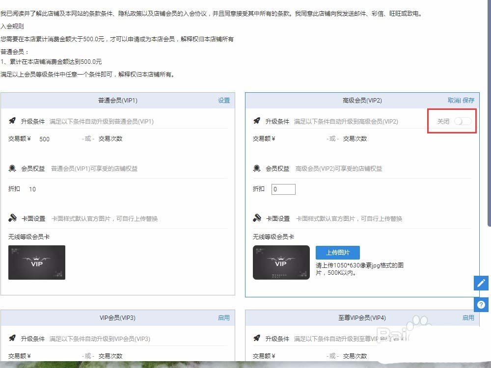 9、高級會員、VIP會員、至尊VIP會員的升級條件是默認關閉的,點擊右側【關閉】選項就啟用了。
