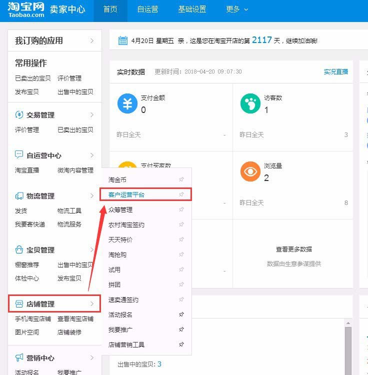 2、在賣家中心首頁左側菜單欄中找到【店鋪管理】,點擊右側小三角,在列表中點擊【客戶運營平臺】。