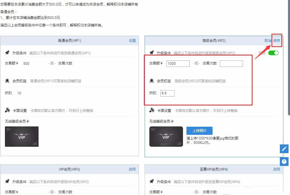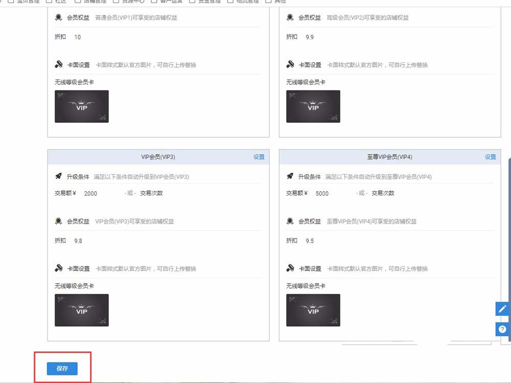 11、繼續把VIP會員和至尊VIP會員的門檻,四個都設置完成后點擊【保存】。