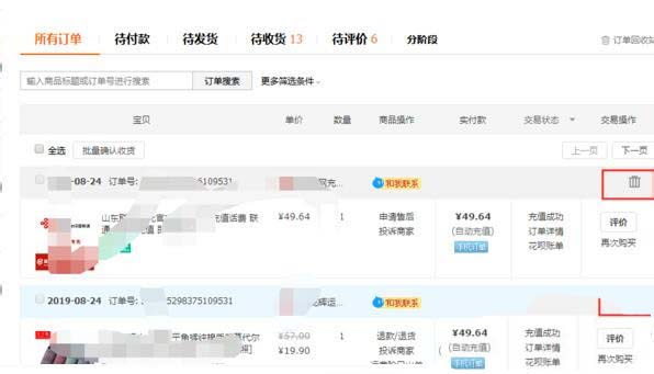 4、此時打開一個新的界面,在打開的界面中,找到淘寶代付的訂單,點擊后面的刪除按鈕