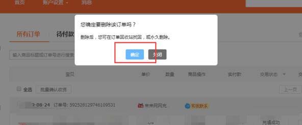 5、出現的對話框中,點擊“確定”按鈕,這樣淘寶找人代付的記錄就被刪掉了