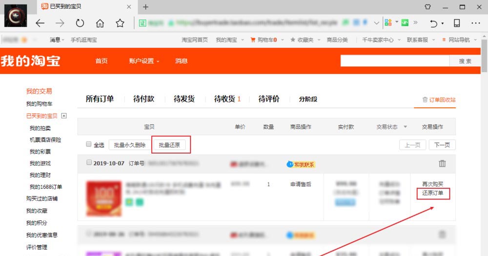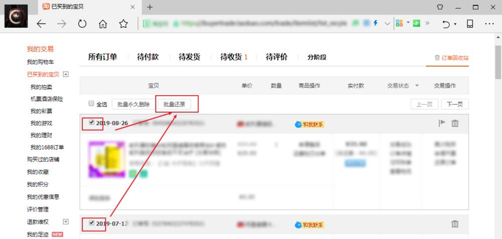 5、如果你想還原多個訂單,請勾選你需要還原的訂單,并點擊【批量還原】