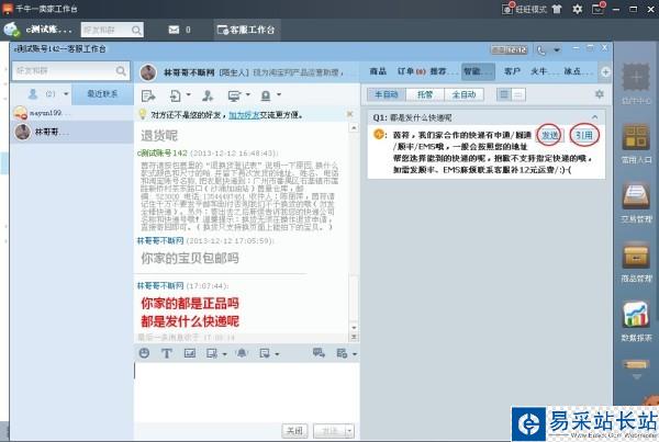 第三步:點(diǎn)擊到智能機(jī)器人的頁面,可以看到機(jī)器人自動識別買家的問題。對于推薦的回復(fù),需要修改的,點(diǎn)擊“引用”可在輸入框直接修改(或右鍵單擊推薦回復(fù)框修改);對于不需要修改回復(fù)的,直接點(diǎn)擊“發(fā)送”即可完成回復(fù)。