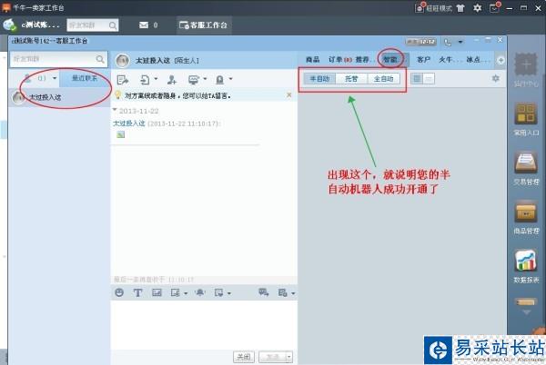第二步:對方有對話記錄過來,系統(tǒng)就默認(rèn)啟動了機(jī)器人了。留意頁面右側(cè)的tab,就能找到智能機(jī)器人;