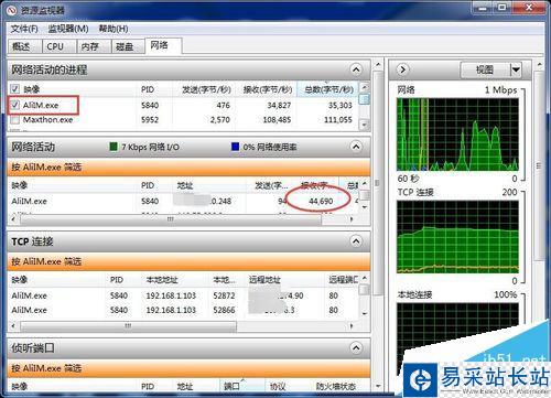 3、在【網絡】的網絡活動的進程中選擇AliIM.exe,而【網絡活動】中我們可以看到有ip地址的列表,我們如何定位所需要的賣家的ip地址呢,可以通過發送和接受的字符數來確認,可以發送一些較大的圖片來進行刪選。