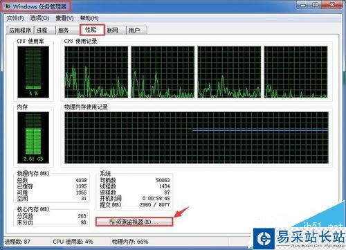 2、啟動任務管理器,選擇【性能】,點擊【資源監視器】。