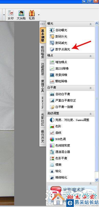 好的,現在我們開始進行補光的程序,圖片是光影右側的工具欄,我們選擇數字點測光,