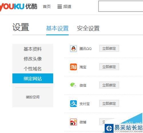 4、點擊綁定網站,接著點擊綁定淘寶,完成優酷綁定淘寶