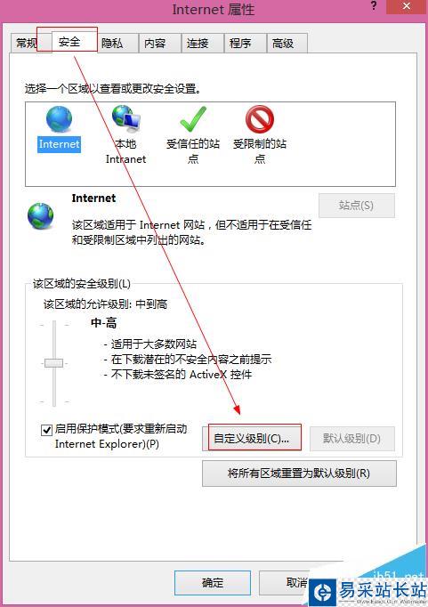 3、打開Internet選項,選擇安全標簽,然后選擇自定義級別,進行設置。