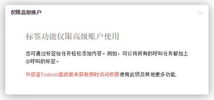 如圖1所示,我是非付費用戶,這是頁面的左側(cè)欄,“標簽”功能所在的位置緊隨“項目”之后,位置很明顯,很容易讓人理解為基本功能之一,但是當點擊之后,馬上跳出圖2的提示。