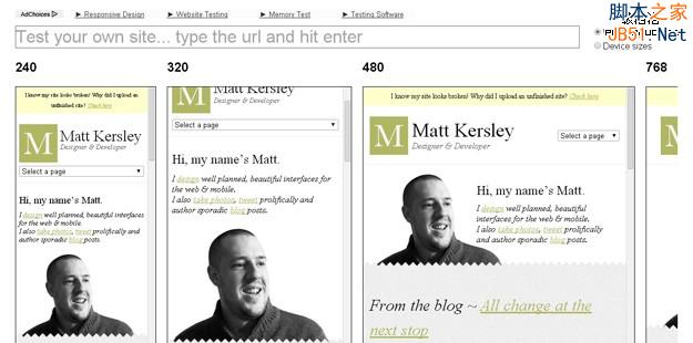 Responsive.Is 是TypeCast所開發(fā)的響應(yīng)式測試工具,令人印象頗為深刻。測試方式也很簡單,輸入需要測試的網(wǎng)站的URL,Responsive.Is會根據(jù)你選擇的設(shè)備自動檢測。